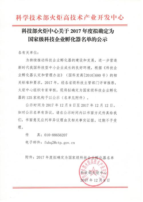 科技部火炬中心關于2017年度擬確定為國家級科技企業孵化器名單的公示